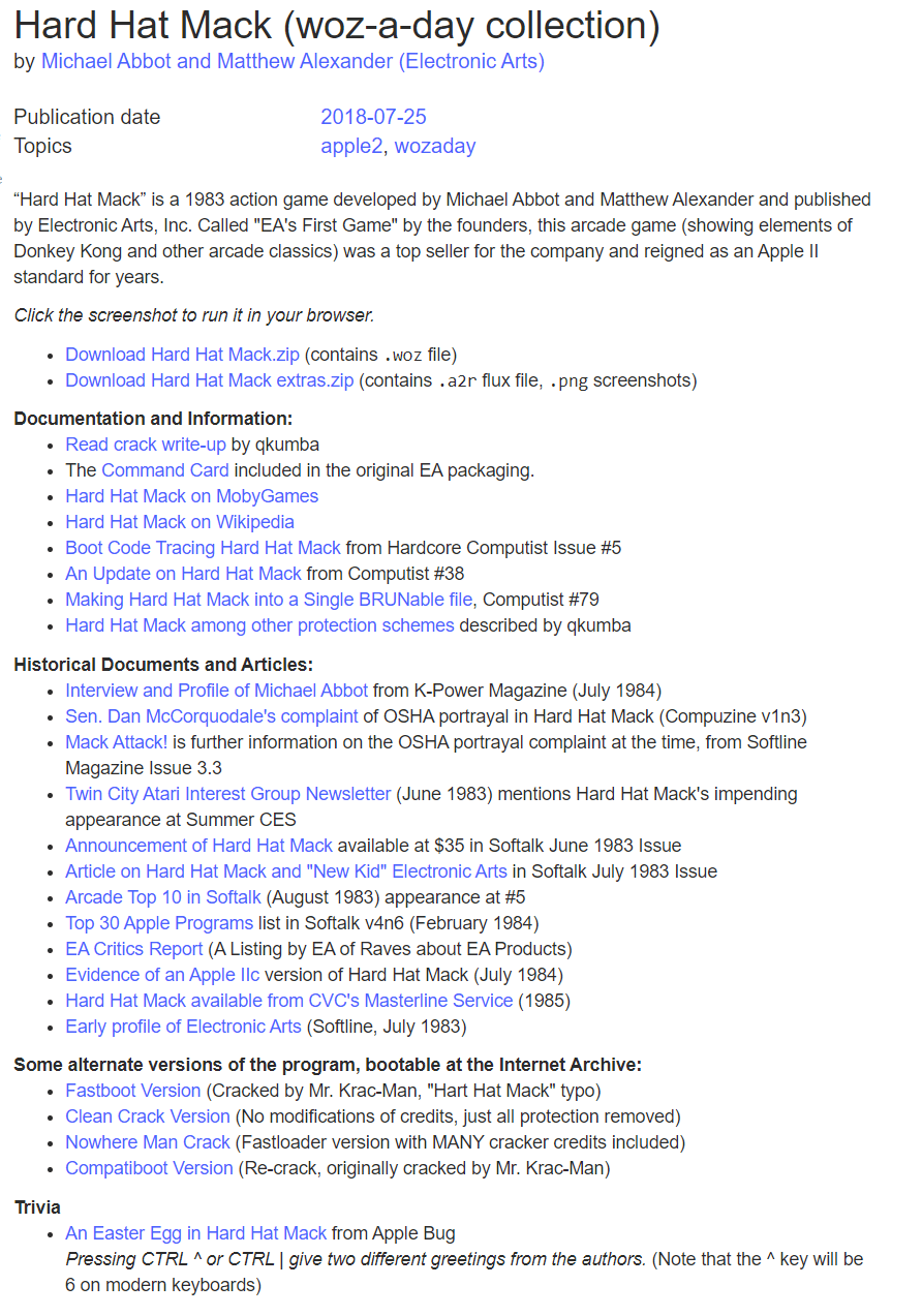They have been acquiring original commercial Apple II software from a variety of sources, including auctions, private collectors, and luck. They’ve been duplicating the originals on a bits level, then going in and “silent cracking” the software so that it can be played on an emulator or via the web emulation system I’ve been so hot on, and not have any change in operation, except for not failing due to copy protection.